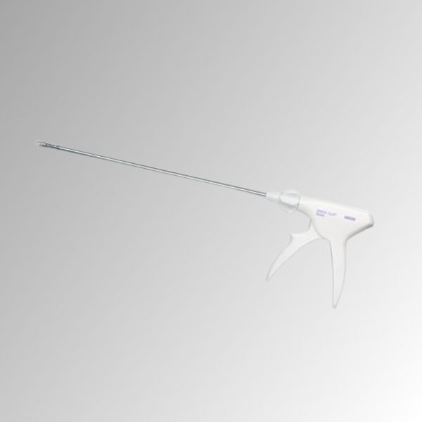 Aplicador de clips de un solo uso con clips de titanio Super Interlock™. El aplicador está diseñado para su introducción y uso a través de un manguito de trocar de tamaño adecuado, o más grande con el uso de un convertidor.